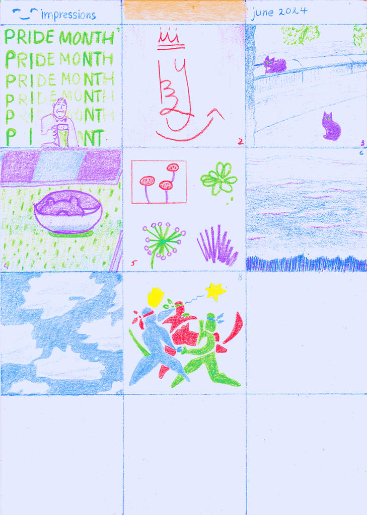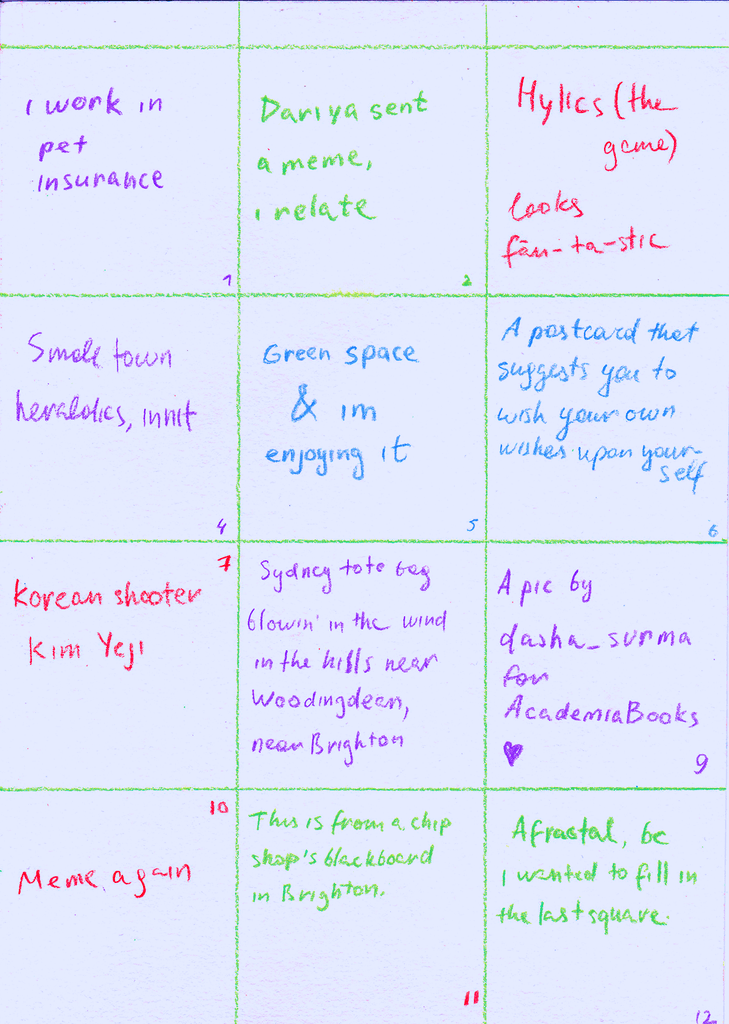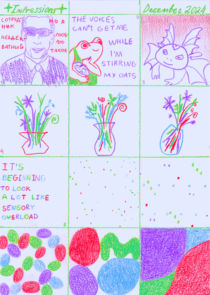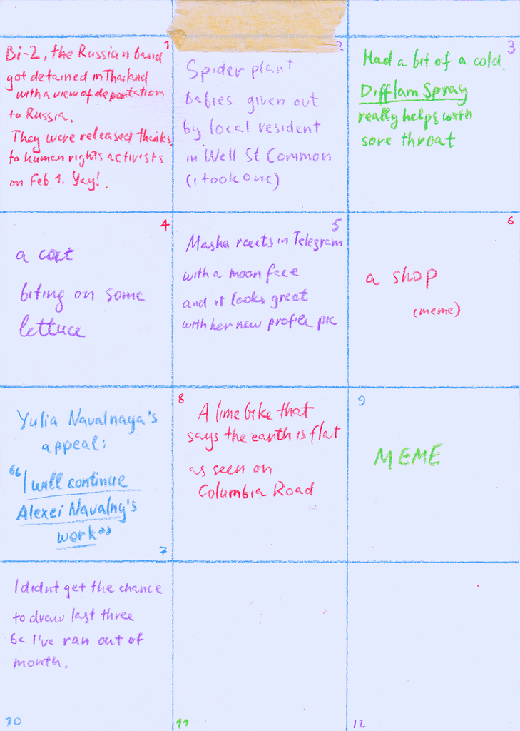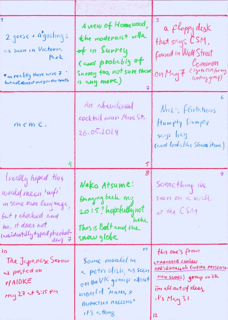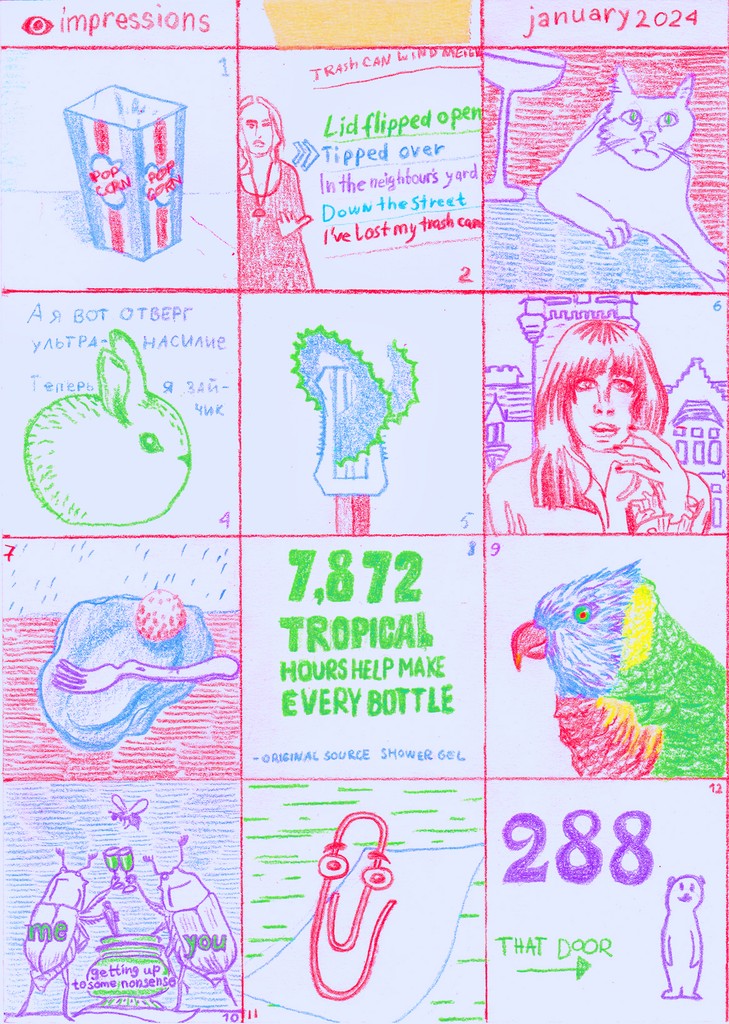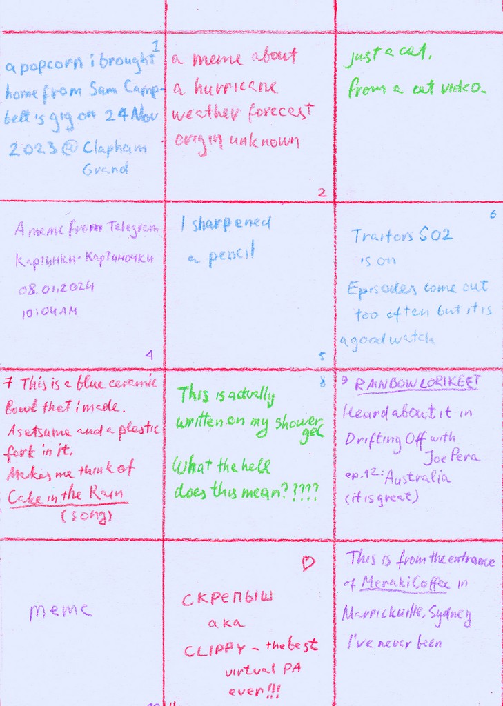 A visual diary of 2024, containing up to 12 squares a month, with notes for some squares on the reverse.